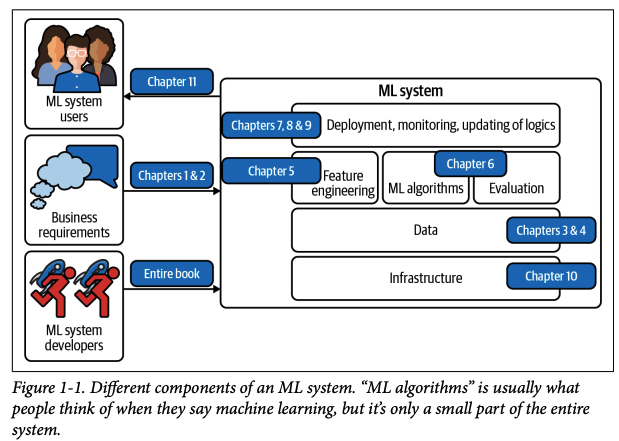 ML 시스템에는 프로젝트의 출발점이 된 비즈니스 요구사항, 사용자와 개발자가 시스템과 상호작용하는 인터페이스, 데이터 스택, 모델을 개발·모니터링·업데이트하는 로직, 그리고 이 로직을 제공할 수 있도록 지원하는 인프라가 모두 포함됩니다.